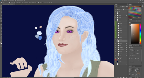 By using various hair sources and the hair colour that was provided for me to use, I carried out the sketch work of the hair using the multiply brush to darken the strands each time I went over them. With each curl and bend, I made sure the directions of the lines followed in its path to represent the different directions the hair was curling in. This works similar to how I created my fantasy character; except I will be keeping all loose strands of hair as I’m focussing on a more realistic look. However, there will be some control using harder lines to define certain details.
